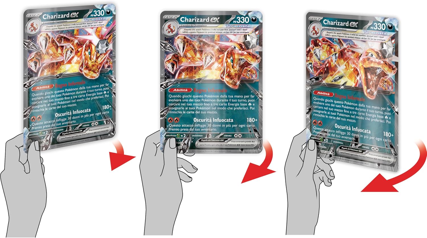 - Troverai una carta promozionale olografica impressa in modo speciale di Charizard-ex, due carte olografiche di Charmander e Charmeleon e una carta lenticolare gigante.