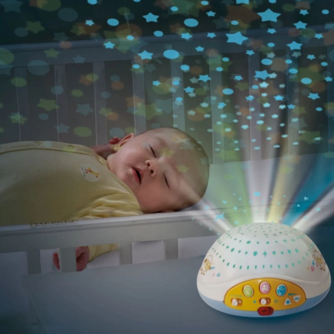 Le proiezioni colorate sul soffitto , tre pecorelle in tessuto e due stelle rimovibile attirano l'attenzione e stimolano il senso visivo del tuo bambino.